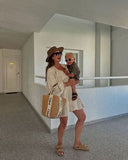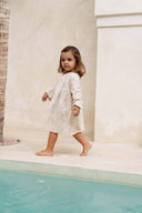 Danielle de ridder with her mini wearing our luna puff dress in tropical beige.
