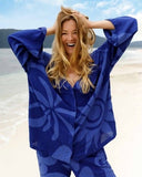 Geraldine Kemper in our co creation TET. X Geraldine, wearing the Pianemo shirt and lagoon pants in kobalt blue.