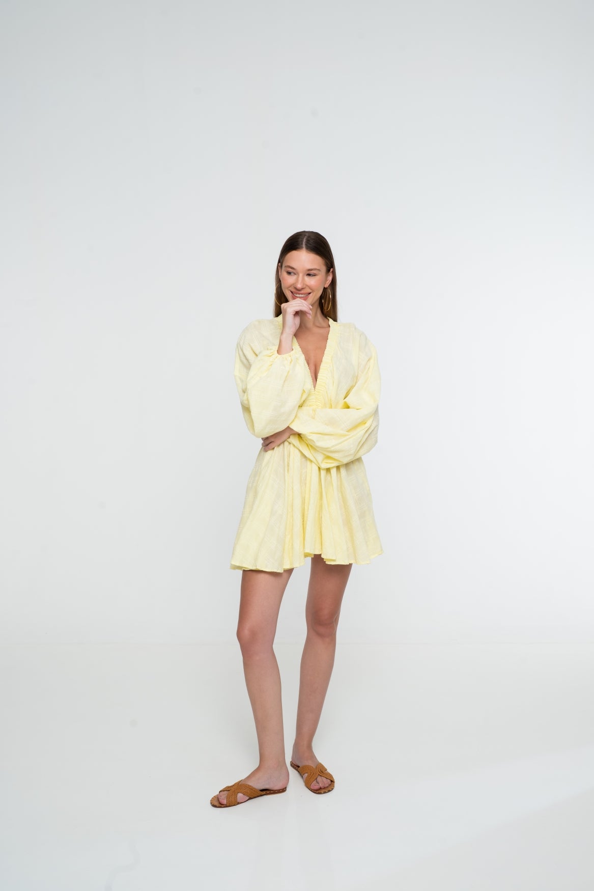 Die sanfte hellgelbe Farbe verleiht dem Kleid eine warme, sommerliche Ausstrahlung, während die leichte Stoffmischung für hohen Tragekomfort und Atmungsaktivität sorgt. Ob bei einem sonnigen Nachmittag, einem sommerlichen Event oder einem Abendessen – das Luna Puff Kleid verbindet Stil, Komfort und zeitlosen Charme.