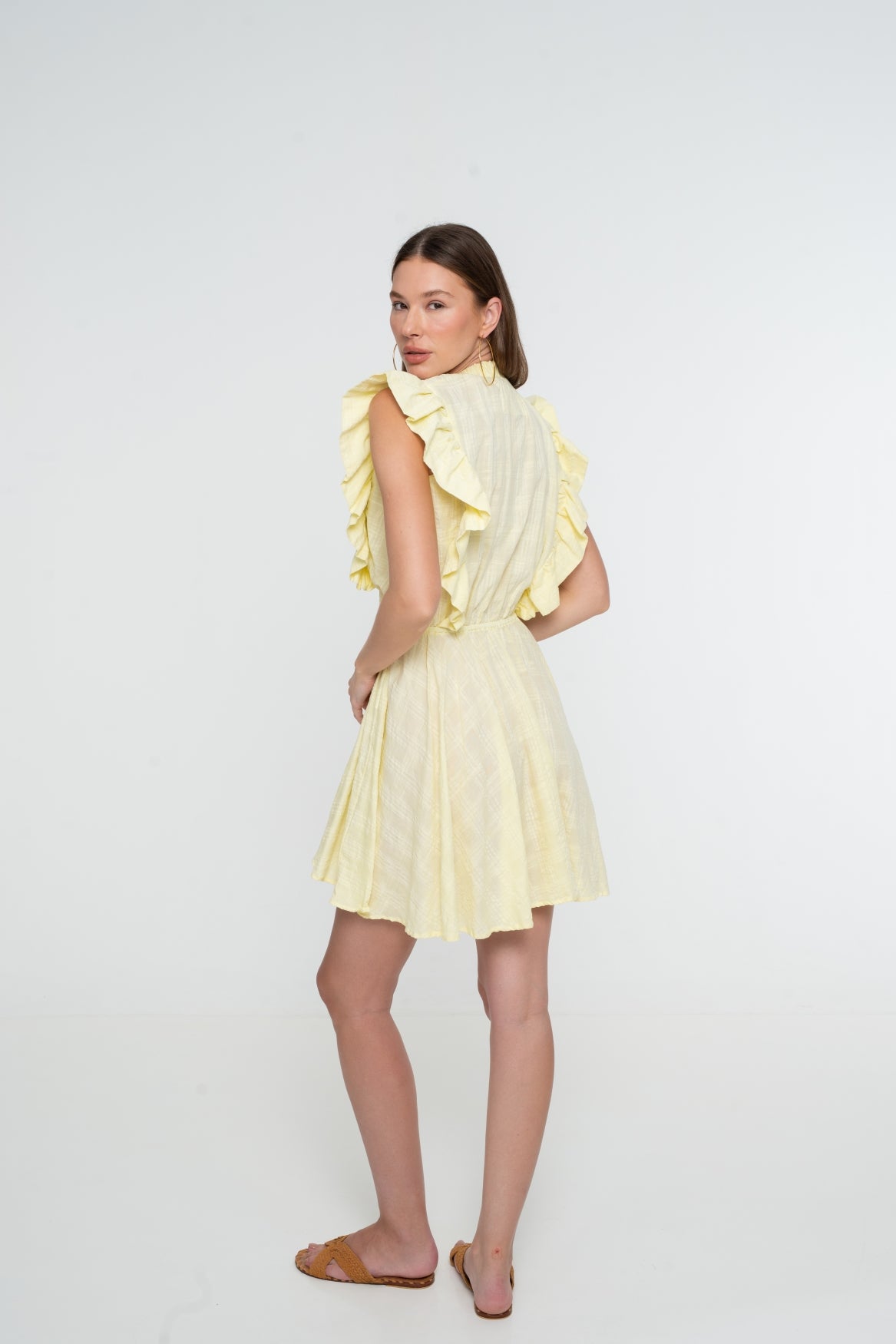 Genieße sonnige Sommertage mit dem Sole Ruffle Kleid in sanftem Hellgelb. Inspiriert vom fröhlichen Geist der italienischen Dolce Vita erinnert der warme Pastellton an mediterranen Sonnenschein und entspannte Tage an der Küste.