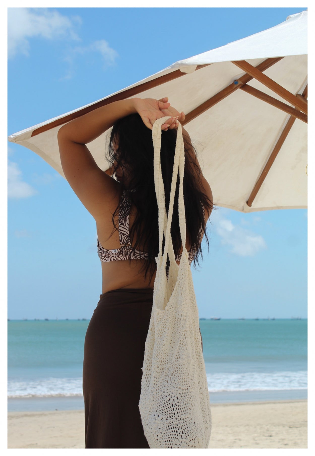 The White Crochet Bag is your new favorite big shoulder bag, beautifully simple and spacious. There is a magnetic button on the inside of the bag to close it easily. The perfect bag for a beach day or to add some crochet detail to your outfit.