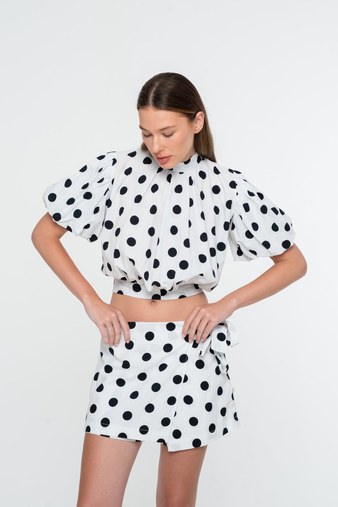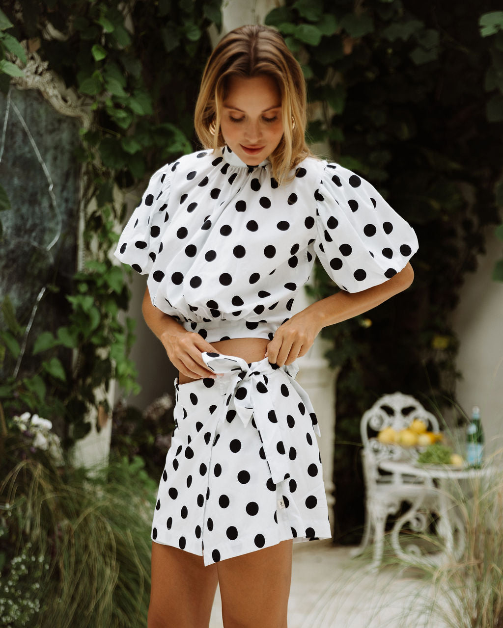 Add a playful and stylish piece to your summer wardrobe with the Georgia Skort in classic black and white polka dot fabric. Combining the feminine look of a skirt with the comfort of shorts, this skort offers both style and practicality for warm days.