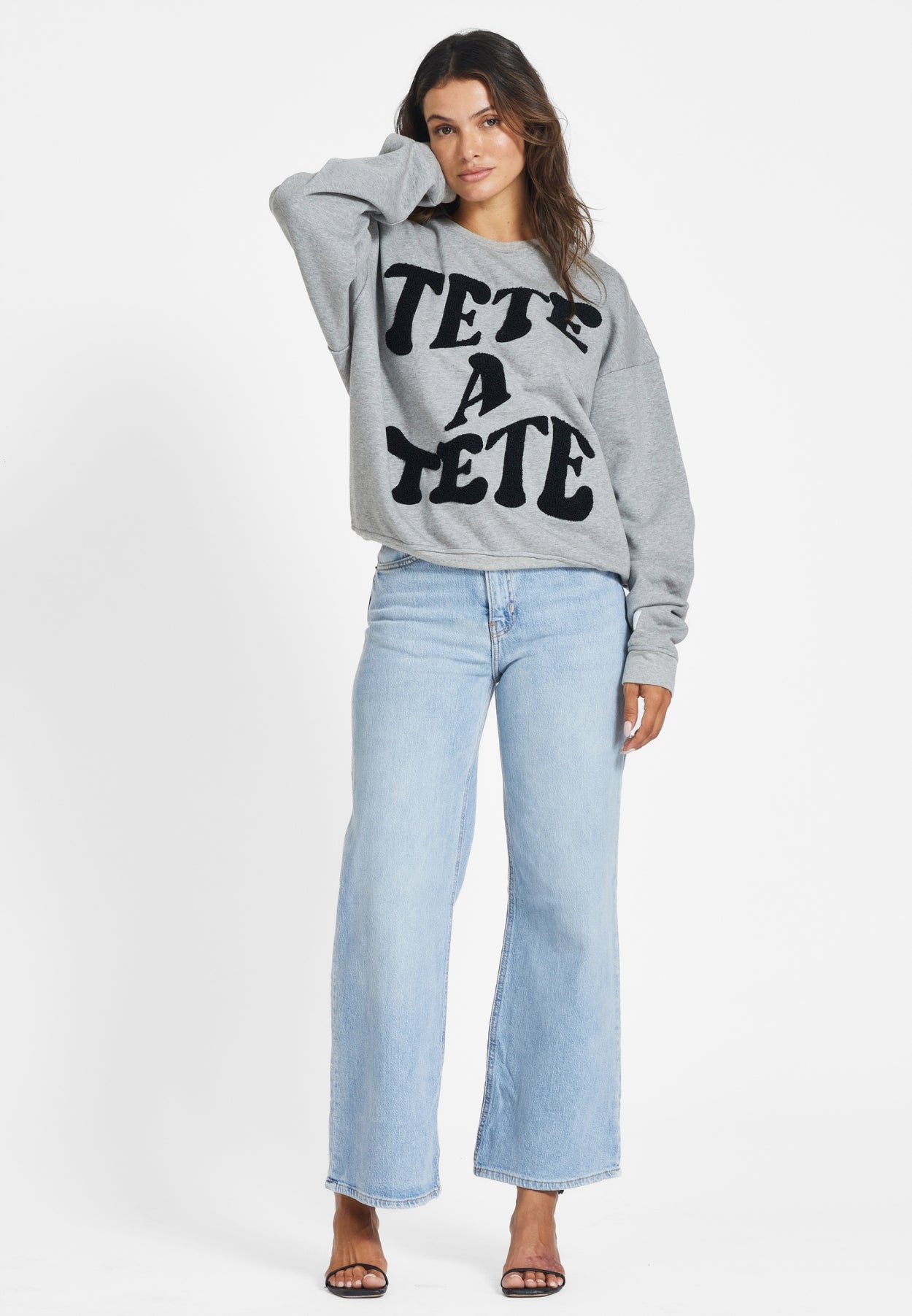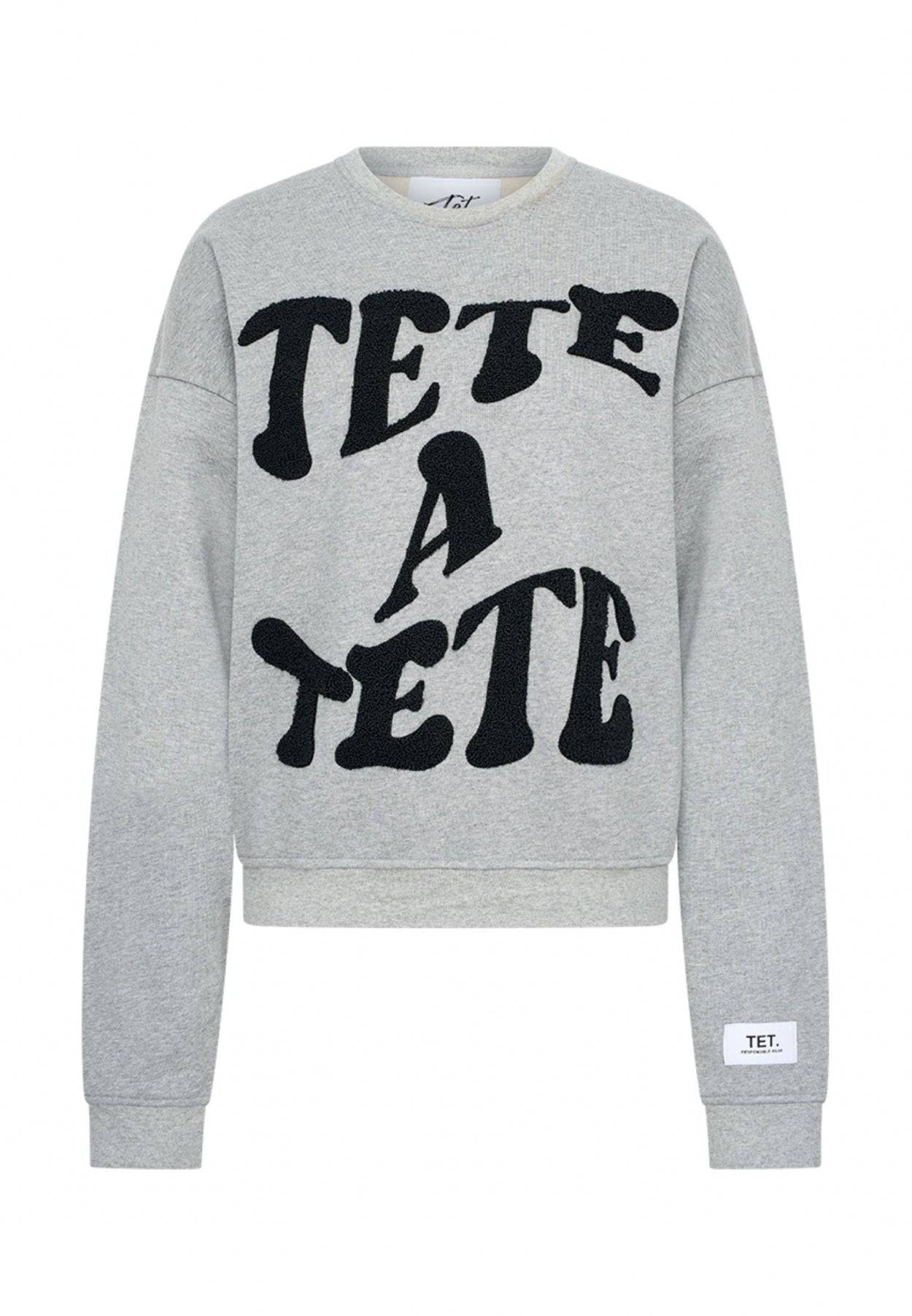 Our Helena print sweater in gray is your cozy companion for the cold autumn and winter days. Crafted from 100% recycled cotton, it not only keeps you warm but also warms your eco-conscious heart. The sweater has eye-catching details which add style and playfulness to your look. It has the text ‘tête-a-tête’ in a green bold font on the front and our brand logo on the left sleeve. Stay snug and responsible in our Helena Print Sweater.