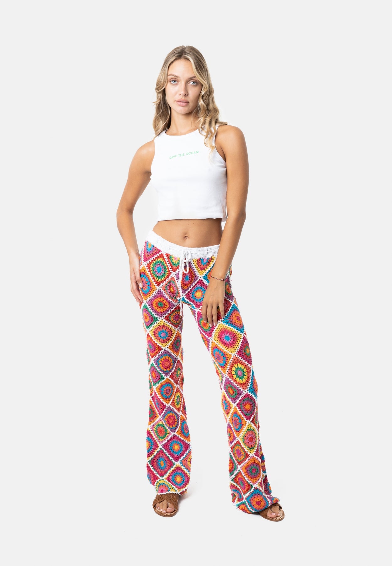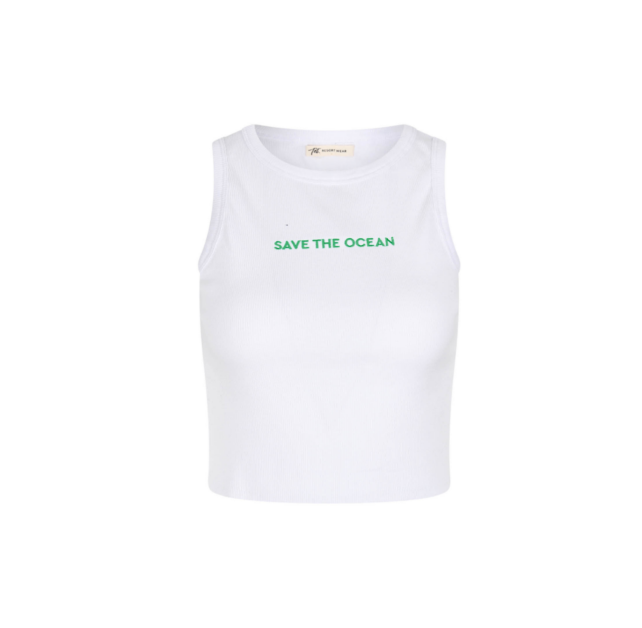 On the front of the Tanktop, the green text Save the ocean is stitched on.