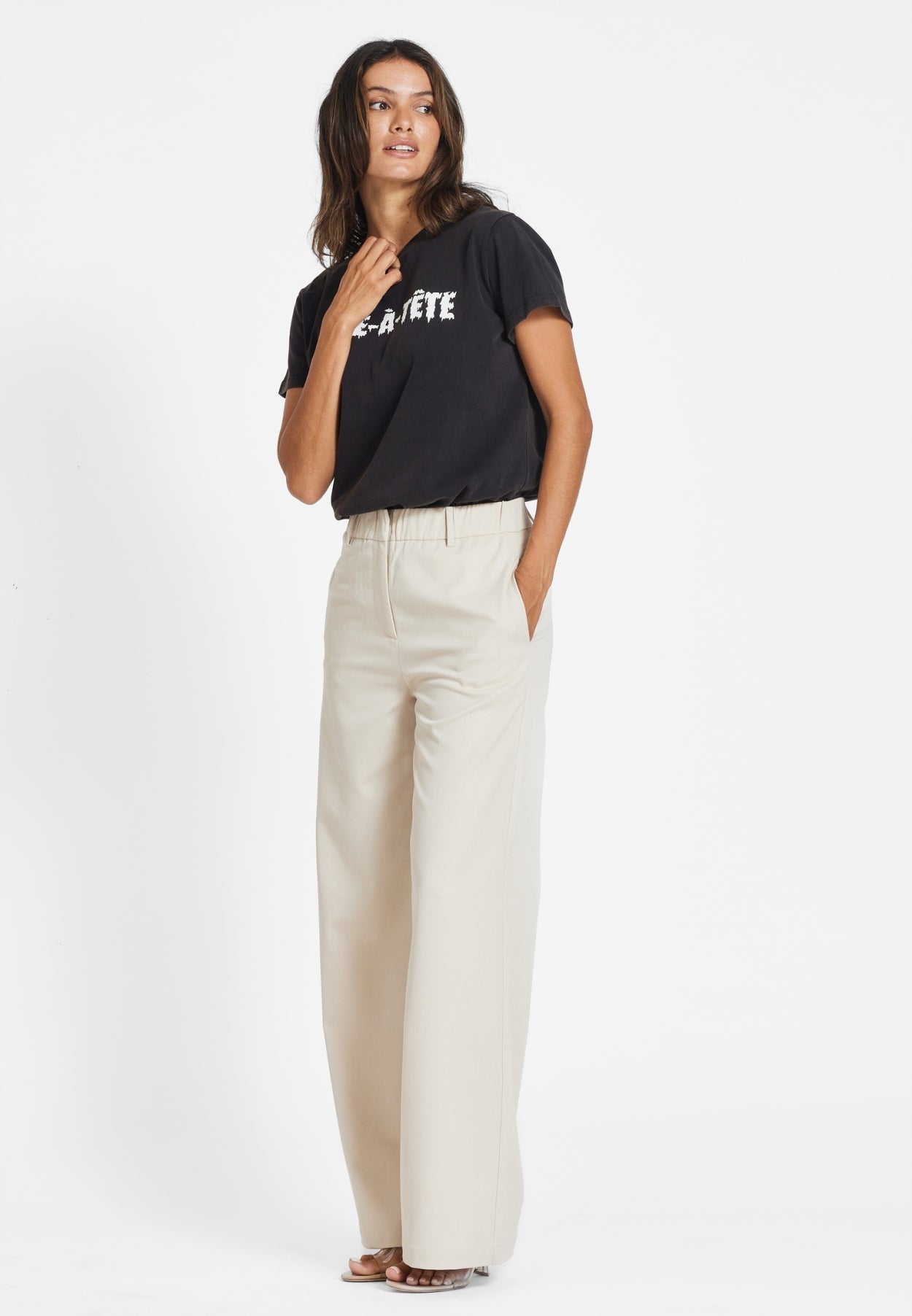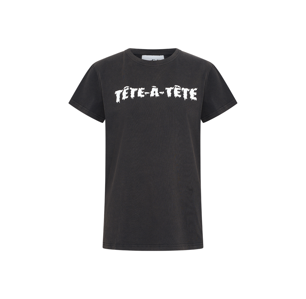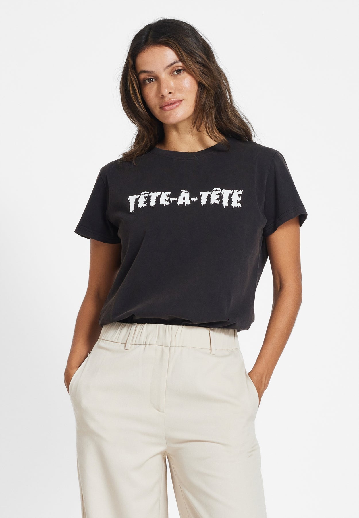 Our Stephanie Tee is made from organic cotton and feels super soft on the body. Featuring black bold text ‘tête-à-tête’ on the front.