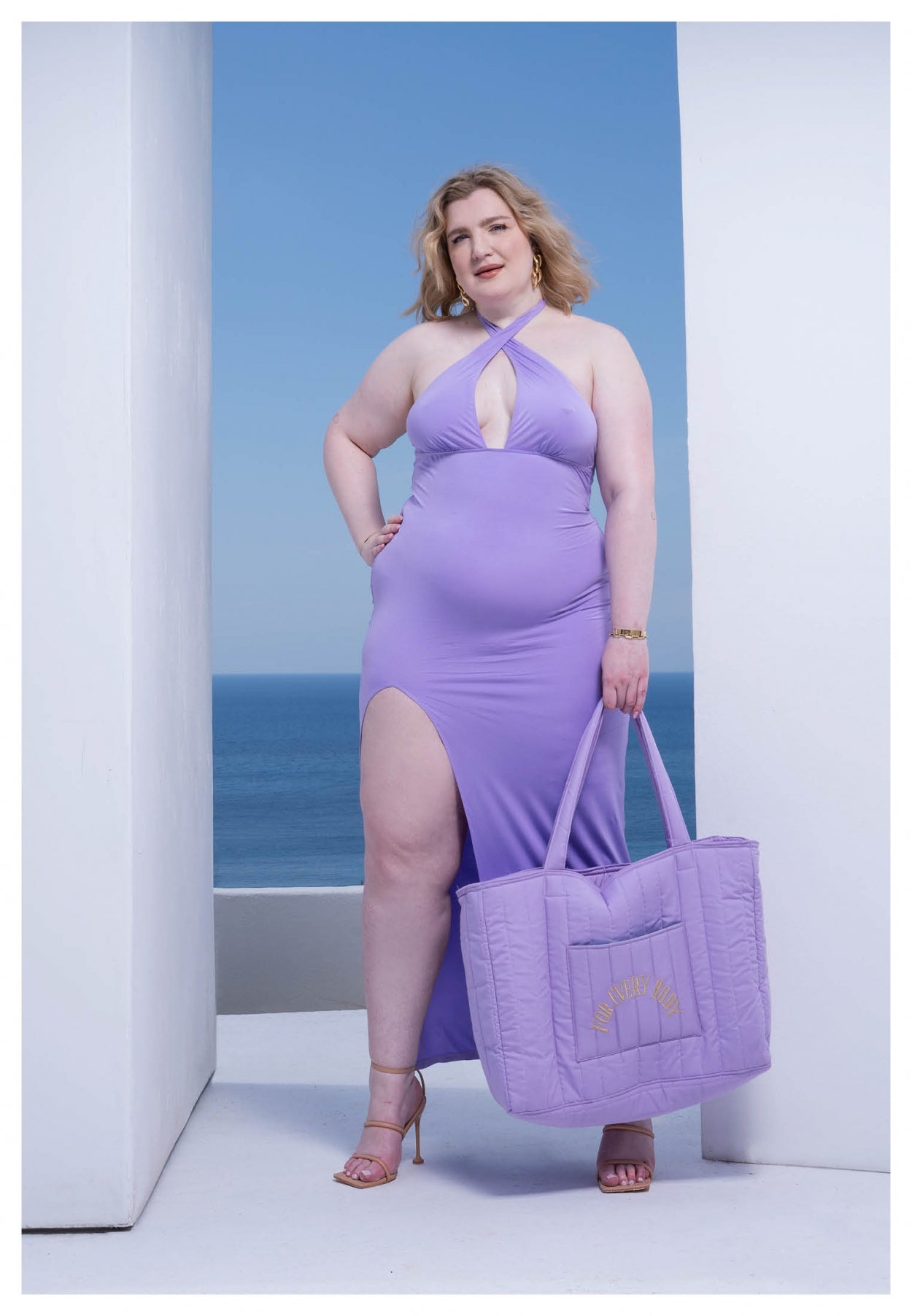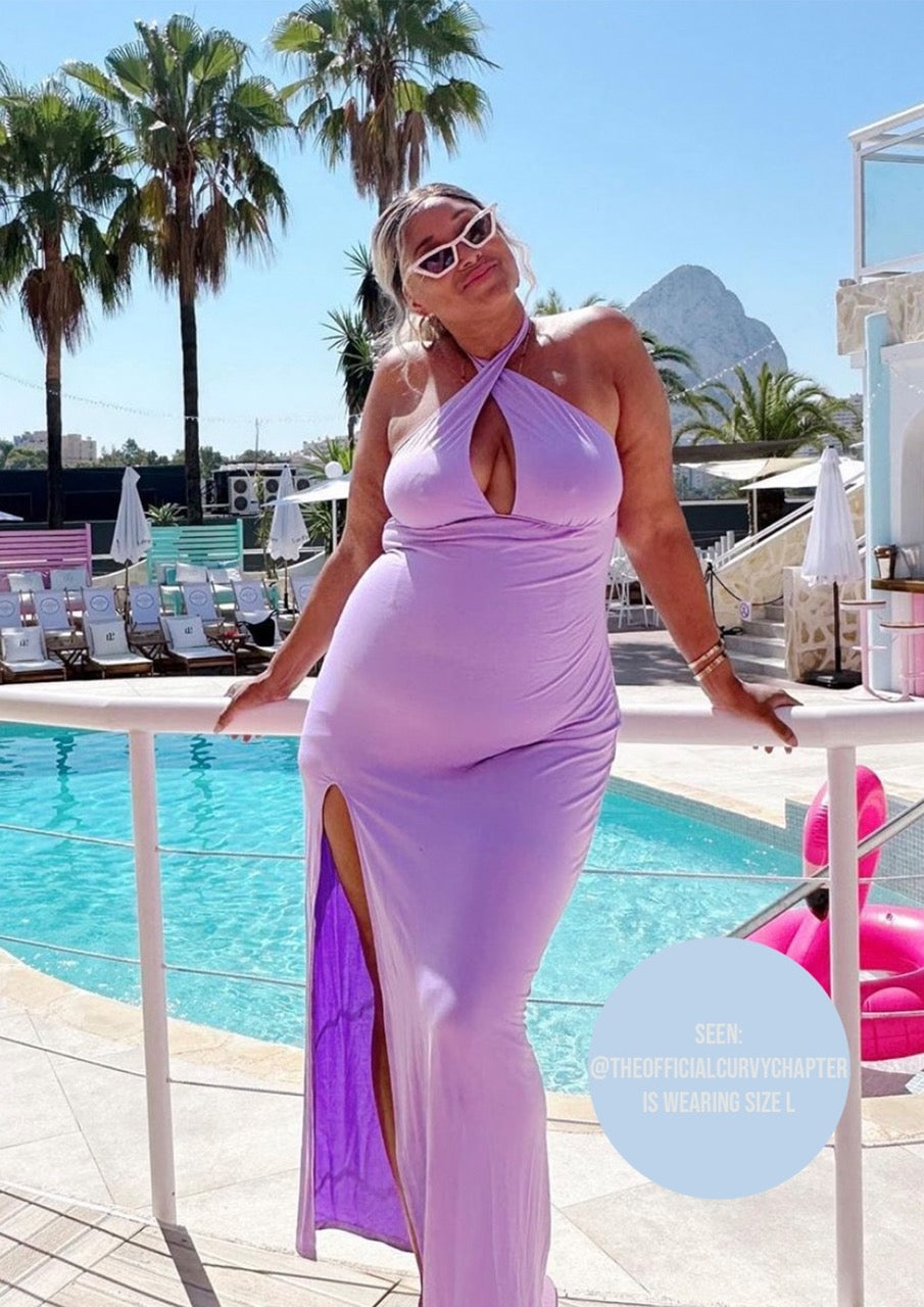 Crafted from a high-quality stretchy material, the "Trio Dress" is both comfortable and stylish. Its ankle-length design and high slit add a touch of sophistication to your look, while the bright lilac color is sure to make you stand out from the crowd.
